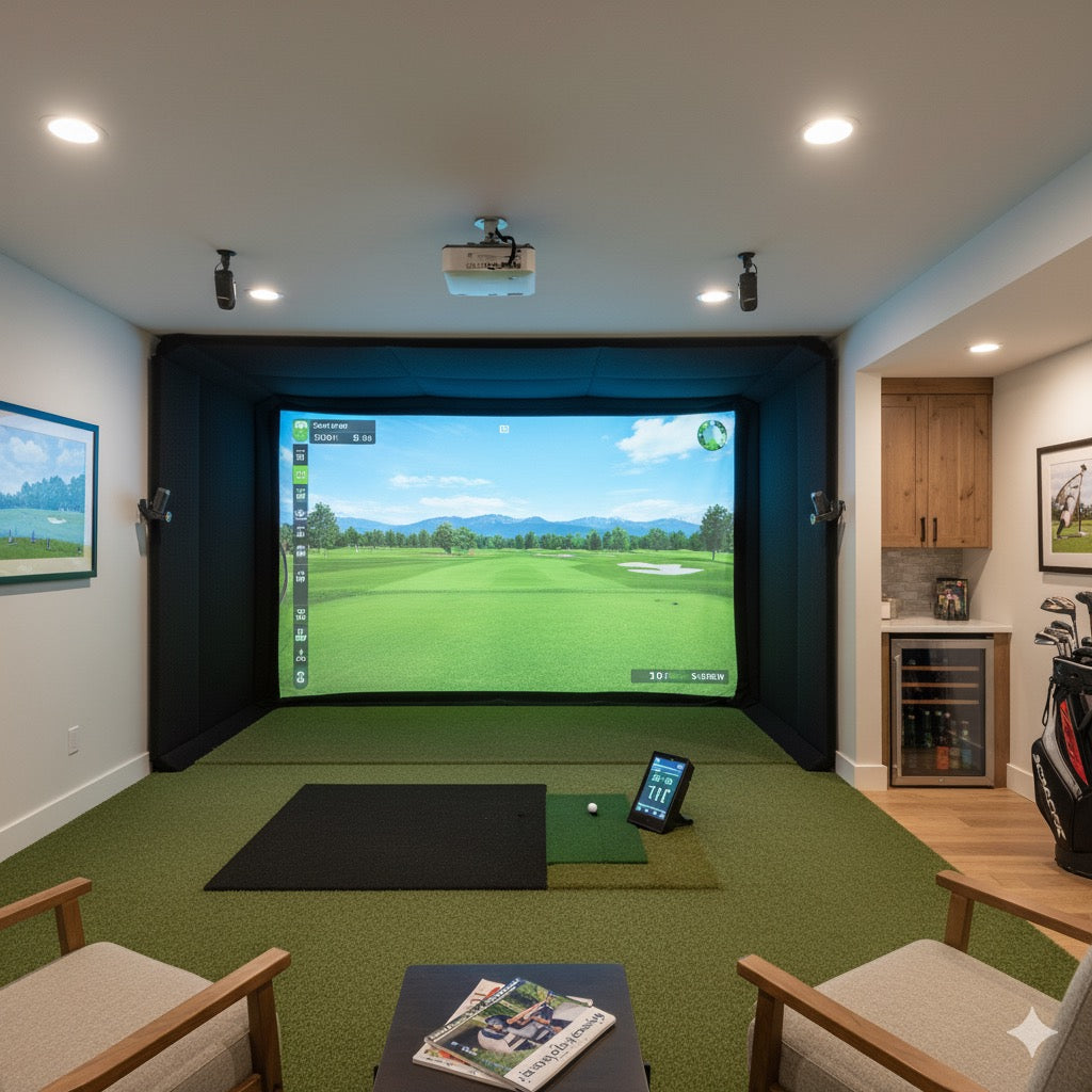 For full golf simulator setups, "Executive" often refers to a particular size designation for the entire enclosure and screen system, typically designed for home or office spaces that can accommodate a sizable setup but may be more constrained than a large commercial space.